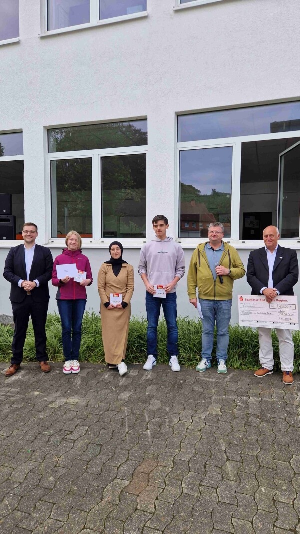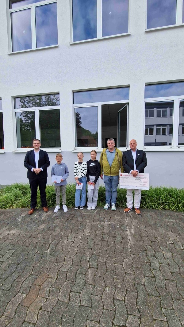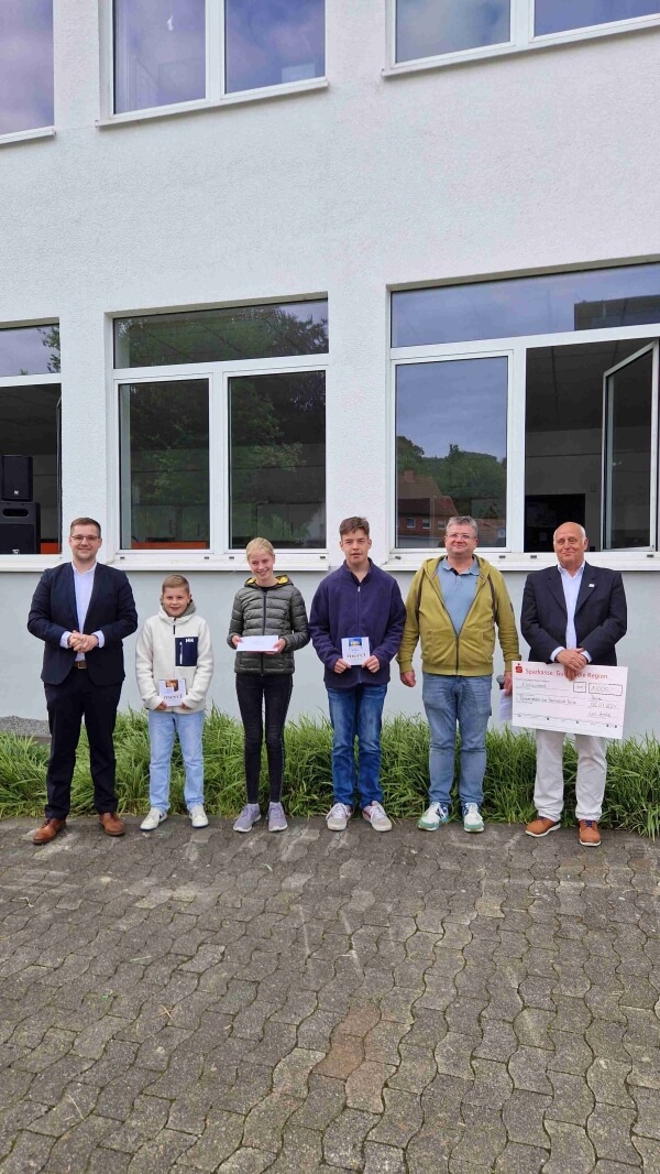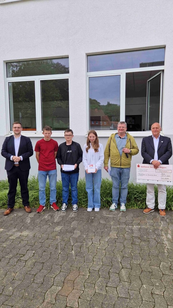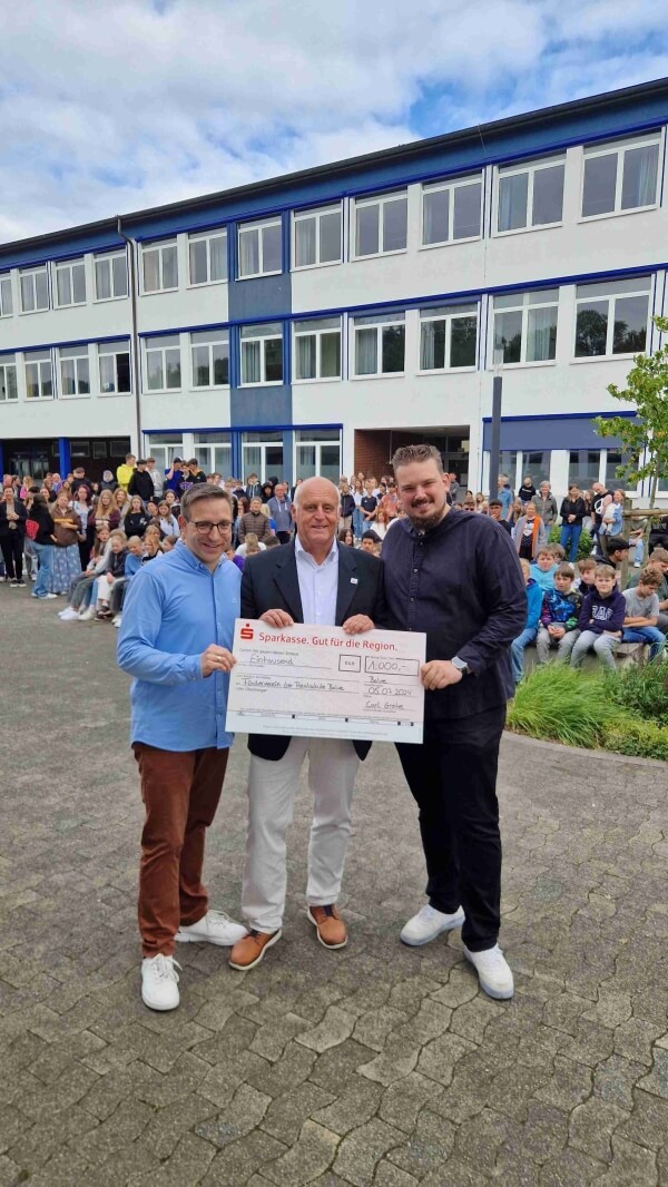 Einen Scheck über die stolze Summe von 1000 € überreichten Carl Grote und Lukas Koch im Auftrag der Jahrgangsstufe an Martin Skiba, den Vorsitzenden des Fördervereins.
