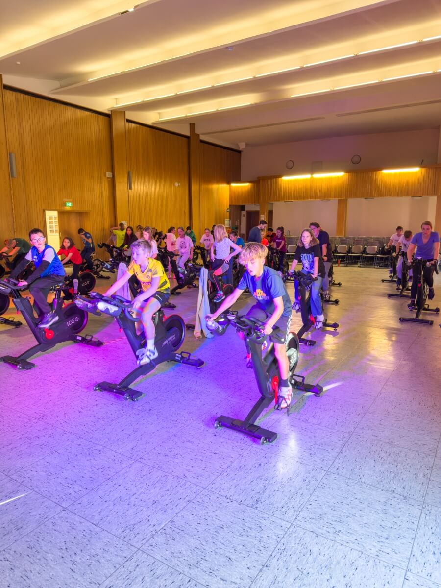 Bereits am Freitagmorgen traten die Schülerinnen und Schüler klassenweise zum Indoor-Cycling-Marathon an. „Der Andrang war riesig, teilweise mussten wir Kinder regelrecht von den Rädern ziehen, um Platz für die nächsten zu schaffen“, erzählte HönneVital-Chefin Anja Dransfeld mit einem Augenzwinkern.