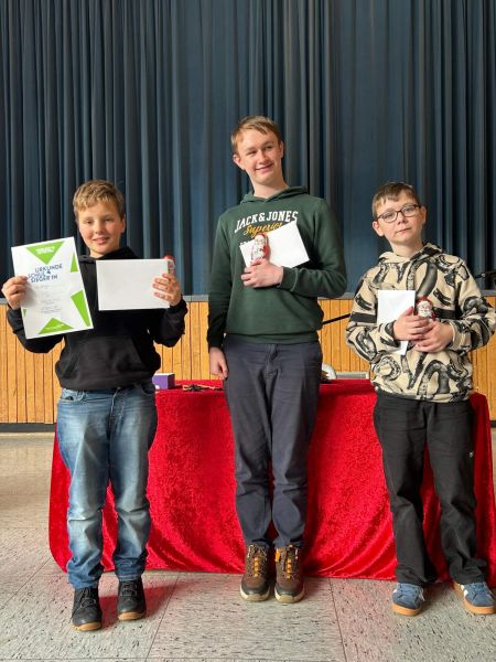 Am Ende des Wettbewerbs wurde Luis aus der 6a zum Schulsieger gekürt. Mit seiner Leistung setzte er sich knapp gegen Jakob aus der 6b und Julian aus der 6c durch. Als Schulsieger wird Luis nun die Städtische Realschule Balve beim Bezirksentscheid vertreten.
