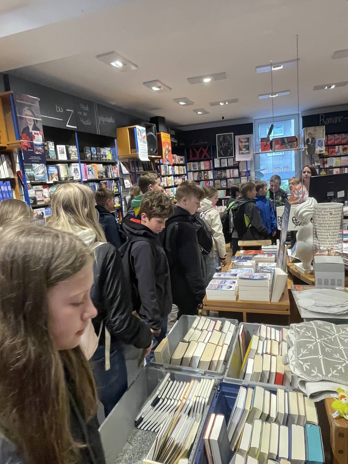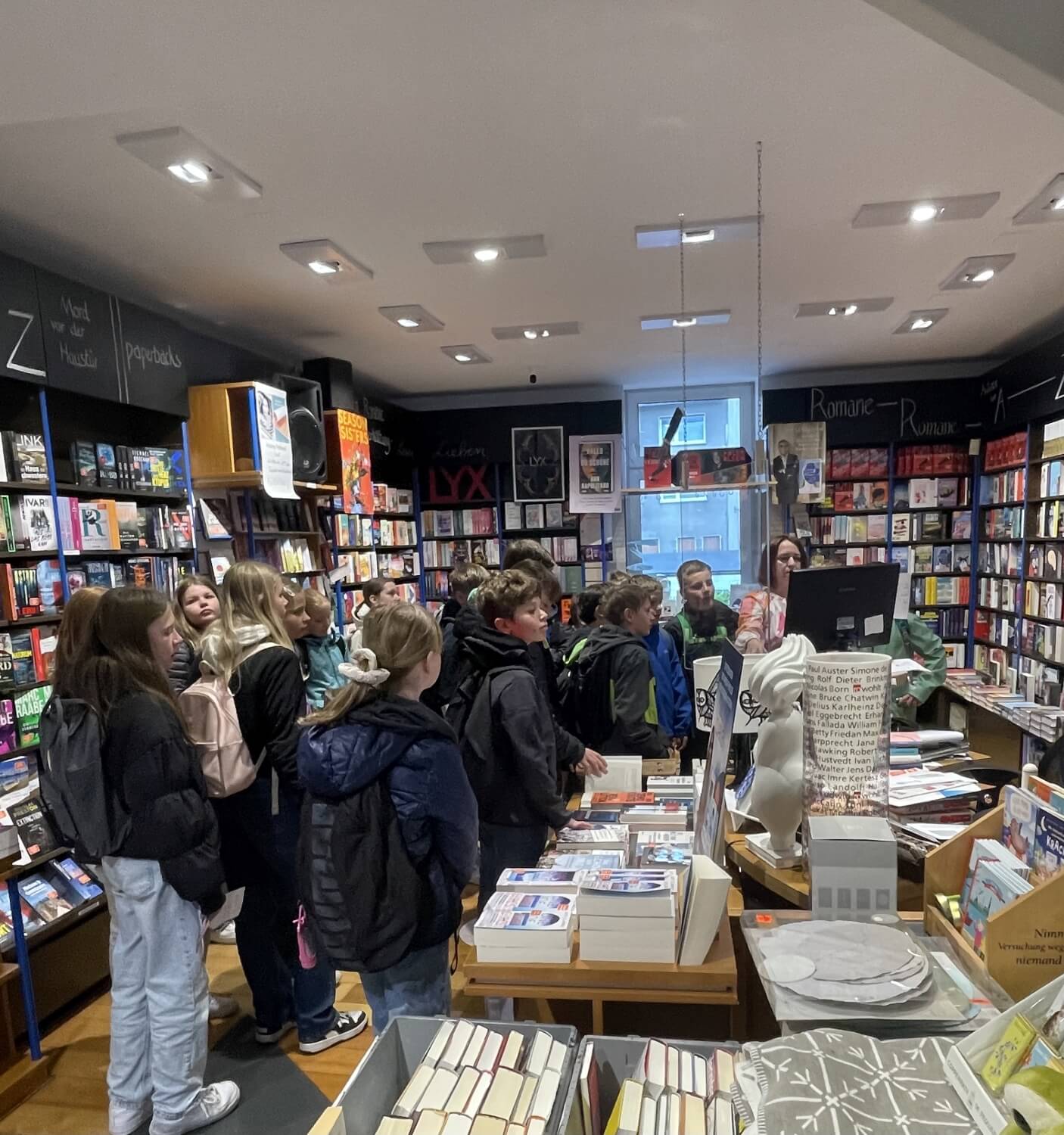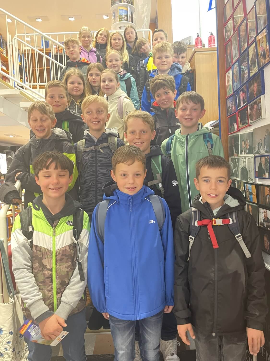 Am 03. Mai unternahm die Klasse 5a einen Ausflug in die Nachbarstadt Menden ... Dort besuchten sie die Buchhandlung Daub, um ihre Buchgutscheine einzulösen, die sie zum „Welttag des Buches“ erhalten hatten. Vorher bekamen die Kinder noch vor der offiziellen Ladenöffnung eine exklusive Führung durch die Buchhandlung und konnten sich so ein Bild von der Angebotsvielfalt machen. Außerdem bekamen sie einen kleinen Einblick in den Ablauf von Bestellvorgängen. Danach gab es für jedes Kind das diesjährige Buchgeschenk „Mission Roboter – ein spannender Fall für die Glücksagentur“. Jetzt kann ausgiebig geschmökert werden.